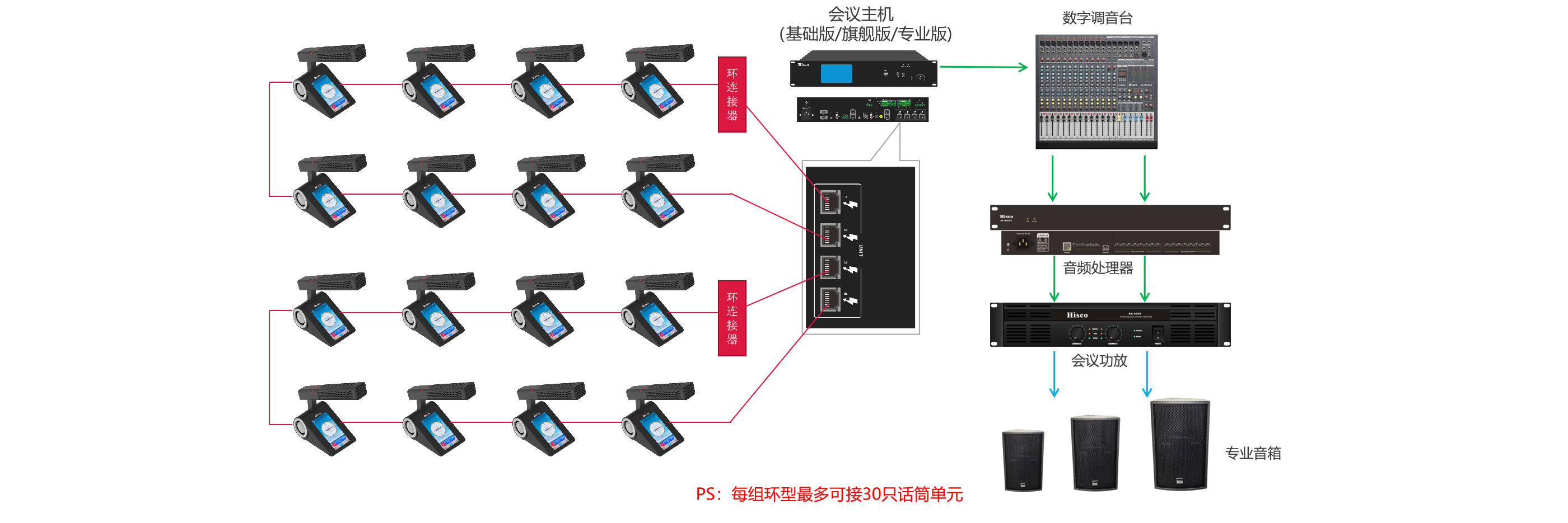 6.与中控对接 7.Dante传输 8.同声传译 9.本地扩音 10.双机热备份
