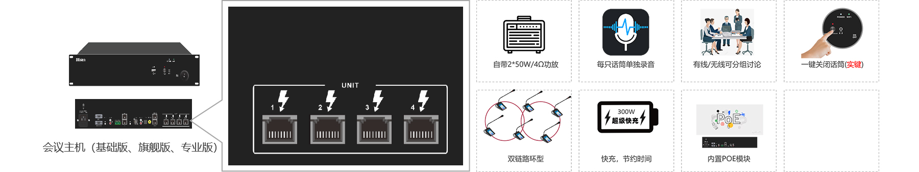 1.大容量接入 2.一键关闭所有无线单元 3.消防联动 4.摄像跟踪 5.发言模式